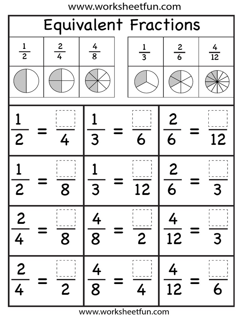 Equivalent Fractions Math Worksheets|Printables PDF for kids Equivalent Fractions Math Worksheets These are equivalent fractions math worksheets to practice fractions and improve your math skills. Download and print free pdf format worksheets to practice. Fractions - Equivalent Fractions 1 Print Worksheet Fractions - Equivalent Fractions 2 Print Worksheet Fractions - Equivalent Fractions 3 Print Worksheet